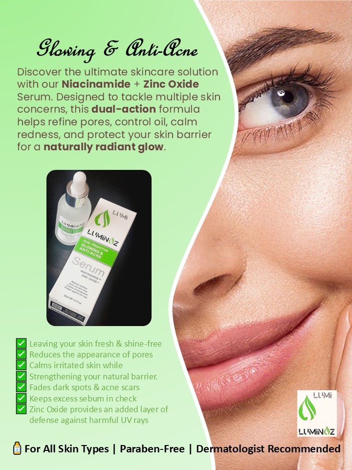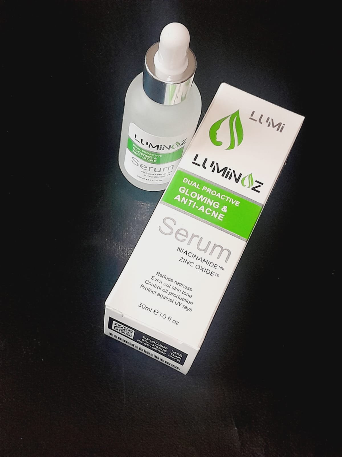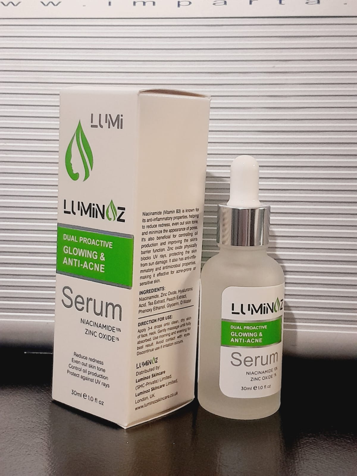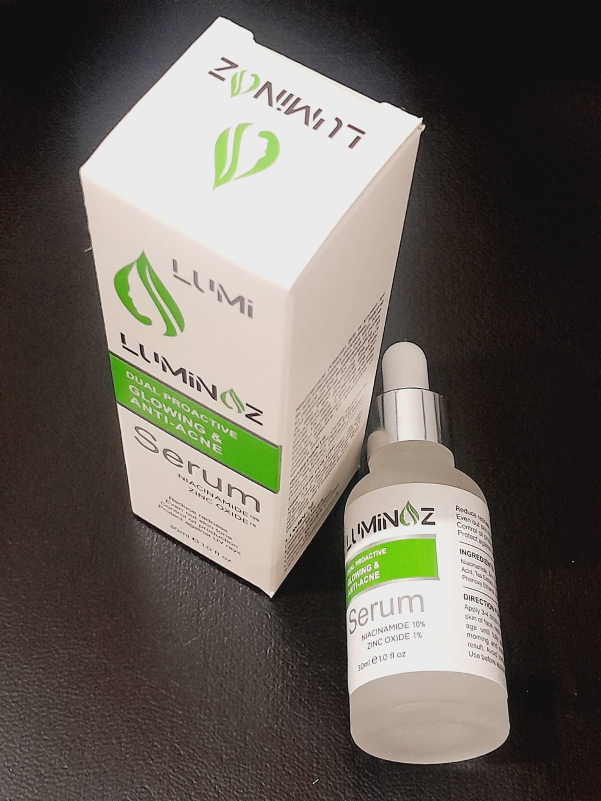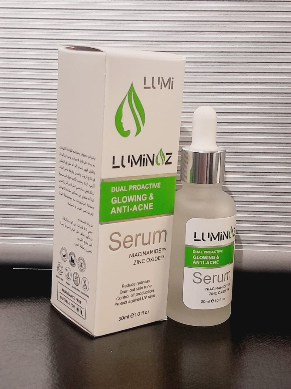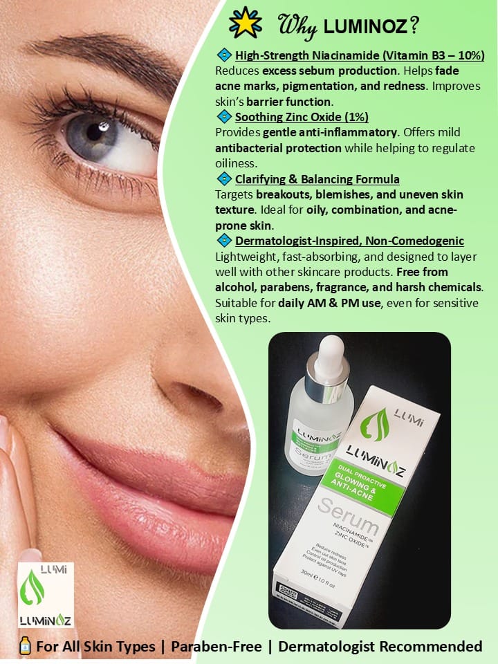 Luminoz Dual Proactive Glowing & Anti-Acne Serum is a lightweight, fast-absorbing formula designed to target acne, excess oil, and uneven skin tone while restoring skin clarity and natural radiance.